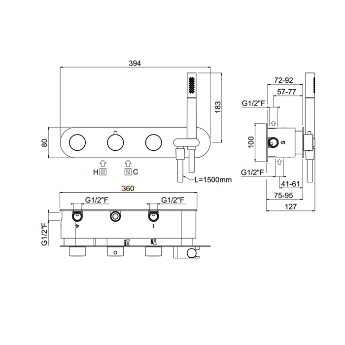 Смеситель для душа, Carimali, ILTONDO, на 4 выхода, тип открывания воды-вентильный, тип регулирования воды-термостатический картридж, монтаж-настенный встраиваемый, в комплекте-одноструйный душ Stick из латуни, шланговое подключение с держателем для ручного душа, гибкий шланг,мм-1500, ПВХ, входы G 1/2’’, внутренняя часть-необходимо заказать, цвет-хром
