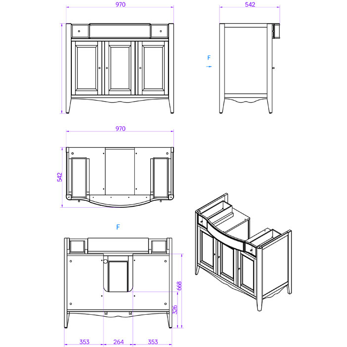 TW Veronica, База с раковиной Simas AR874bi*1 105*56см, с 1отв., 2 верх.ящ. 3 распашные дверки, доводч. Blum, ручки: Riflesso бронза, цвет: noce