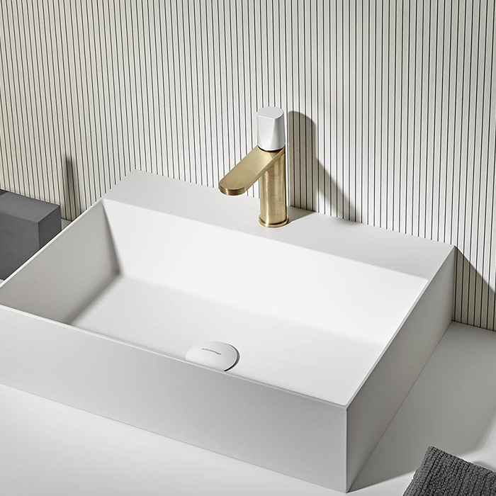 ANTONIO LUPI INDIGO Смеситель для раковины на 1 отверстие, излив 165 мм., ручка белая матовая, цвет сатинированная натуральная латунь