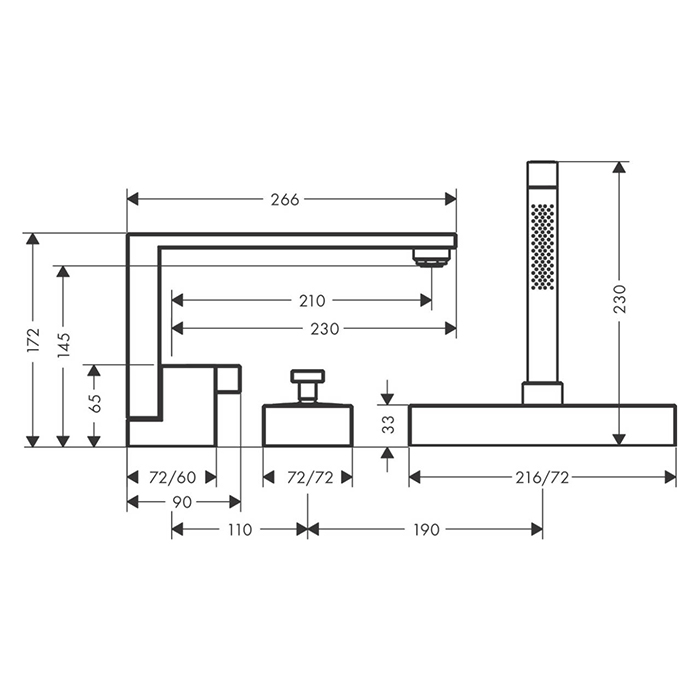 AX Edge Смеситель на борт ванны, на 3 отв., с ручн.душем, излив 210мм, цвет: полир. золото