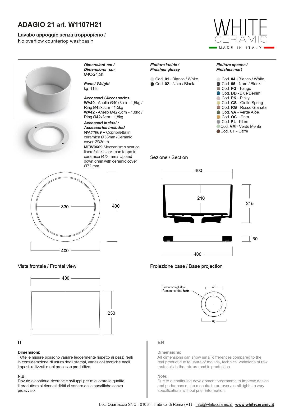 White Ceramic Adagio, накладная круглая раковина Ø40x24,5h см, с накладкой, донным клапаном и керамическим кольцом Ø42 см, цвет белый глянцевый