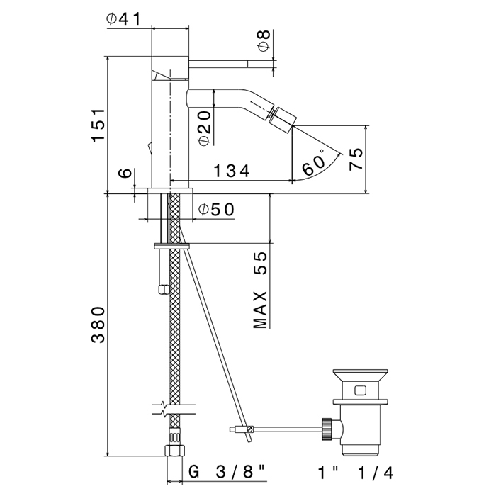 Newform X-Steel 316 Смеситель для биде на 1 отверстие с донным клапаном, излив 134мм, цвет: нержавеющая сталь