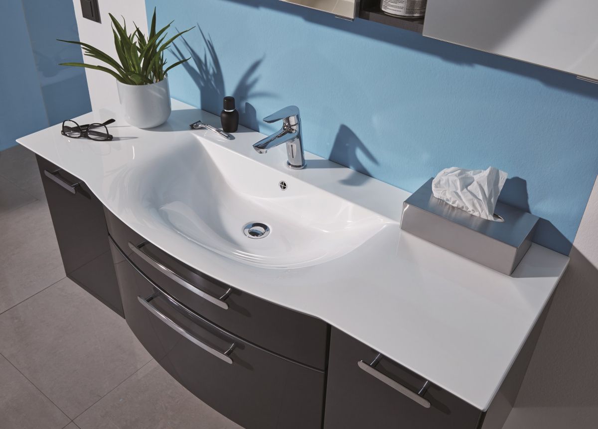 Puris Linea 130 см: тумба (2 ящика, 2 двери) и раковина из мин литья, цвет мебели белый глянцевый